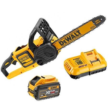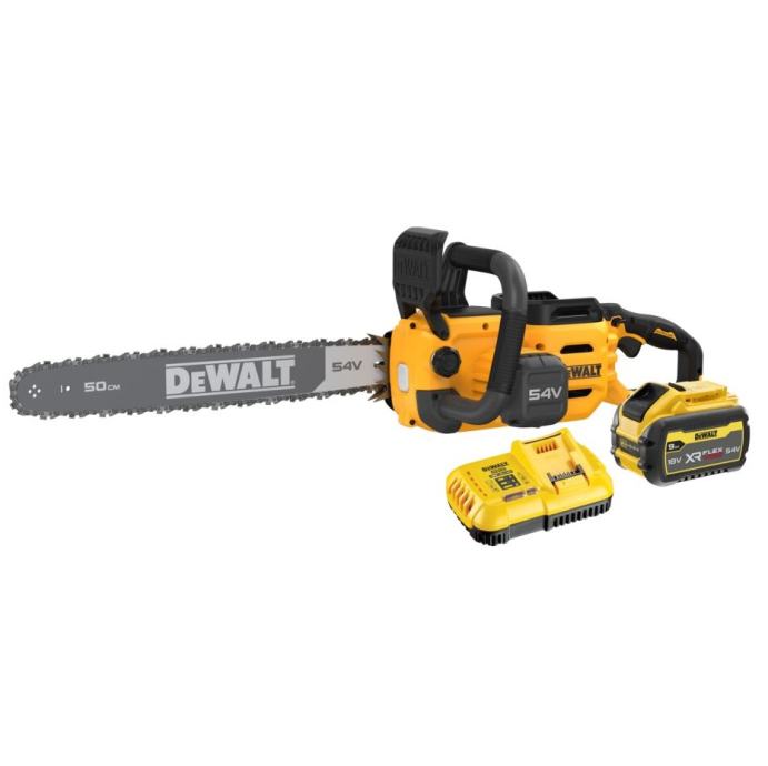 DCMCS575X1 je DeWalt aku lančana pila s duljinom vodilice 50cm. Isporučuje se s akumulatorom kapaciteta 9,0Ah i punjačem. Zahvaljujući motoru bez četkica i tehnologiji FlexVolt 54V, pila ima tehničke parametre usporedive s električnim ili motornim pilama. Brzina lanca do 15m/s i 50cm Oregon vodilica i lanac omogućuju brzo rezanje velikih promjera i do 130 rezova grede 10x10cm. Udobna ručka i prekidač s promjenom brzine osiguravaju gladak i ergonomski rad. Sastavljanje lanca i vodilice bez alata i automatsko podmazivanje jamče udoban rad. Bežično napajanje bez ispušnih plinova i puno buke, ali s performansama popularnih motora s unutarnjim izgaranjem (do 50ccm), izvrsna je alternativa za profesionalce koji rade u šumama ili tesare koji izrađuju oplate i velike drvene konstrukcije. Radni napon: 54V