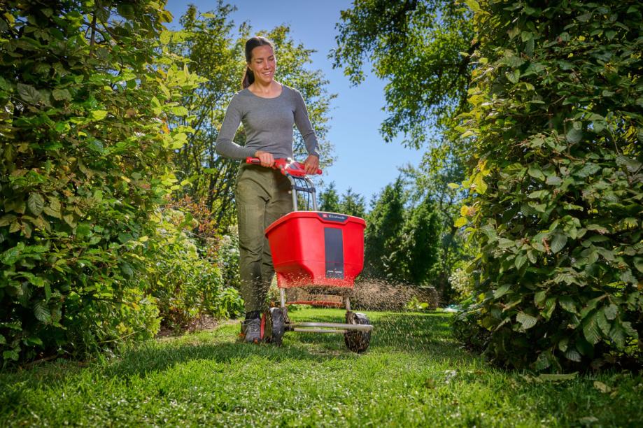 Einhell akumulatorska kolica za sijanje GE-SR 18/22 Li-Solo nisu prikladna samo za njegu travnjaka u ljetnim mjesecima, već i zimi u borbi protiv zaleđenih staza i prilaza. Kao član Power X-Change obitelji, kolica za sijanje se mogu kombinirati sa svim Power X-Change baterijama i punjačima. Energija iz baterije automatski raspoređuje materijal za posipanje – bilo da je riječ o soli za ceste, sjemenu ili gnojivu – po tlu. Količina posipanja se može regulirati u 8 stupnjeva, a brzina posipanja se može podesiti u 6 stupnjeva pomoću elektroničke kontrole brzine. Širina posipanja može se individualno podešavati između 60 cm i 6 metara i prilagoditi površini koja se obrađuje. Spremnik može držati do 22 litre pijeska i stoga nudi veliki kapacitet za velike površine. Zahvaljujući velikim kotačima, laganoj, ergonomskoj aluminijskoj ručki za guranje i ručki s mekanim rukohvatom, baterijski posipač se može optimalno voditi tako da se materijal za posipanje ravnomjerno raspoređuje. Posipač se isporučuje bez baterije i bez punjača. Oni su dostupni zasebno. Solo model – isporučuje se bez akumulatora i punjača