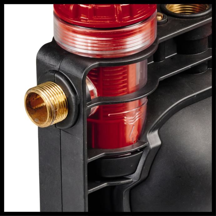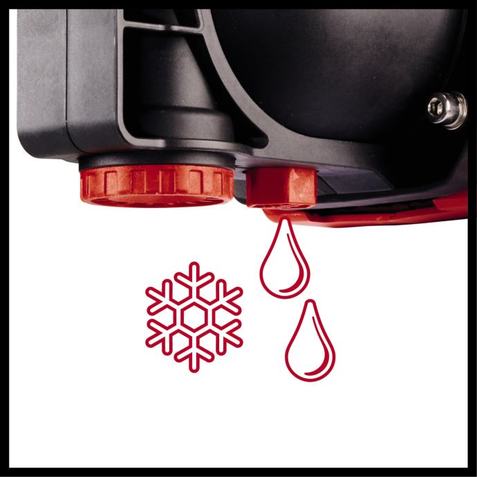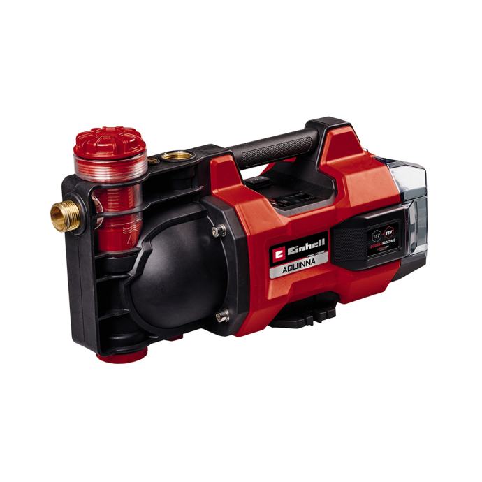 Einhell akumulatorska vrtna pumpa AQUINNA 18/30 F LED snažna je pumpa koja se može koristiti posvuda u kući i vrtu kada je potrebno opskrbiti vodom bez zasebnog priključka za napajanje. AQUINNA 18/30 F LED dio je fleksibilne obitelji Power X-Change, u kojoj se mogu kombinirati sve baterije, punjači i uređaji sustava uključujući alate i vrtnu opremu. Pumpa radi pomoću baterije od 18 V. Zahvaljujući tehnologiji Double Runtime i dva integrirana utora za baterije, crpka se također može opremiti s dvije baterije za dulje vrijeme rada. Ako je jedna baterija prazna, napajanje se automatski prebacuje na drugu, punu bateriju. Kapacitet dviju baterija može se u svakom trenutku vidjeti na LED zaslonu razine napunjenosti. Vrtna pumpa opremljena je s dva načina rada: BOOST način za maksimalni protok i ECO način za maksimalno trajanje baterije pri nižem tlaku isporuke. AQUINNA 18/30 F LED može isporučiti do 3000 litara vode na sat. Može se doseći maks. visina isporuke od 28 metara, što odgovara maks. pritisku isporuke od 2,8 bara. Voda se može usisati s dubine do 6 metara. Za jednostavno punjenje, npr. tijekom prvog procesa usisavanja, pumpa ima veliki vijak za punjenje vode. Pumpa se jednostavno prazni, posebno za zaštitu od smrzavanja zimi, uz pomoć vijka za odvod vode na donjoj strani. Za zaštitu od onečišćenja, crpka je opremljena predfilterom. Okružen je prozirnim kućištem, što omogućuje da u svakom trenutku provjerite je li pumpa dovoljno napunjena vodom i je li filtar prljav i treba ga očistiti. Nepovratni ventil također sprječava kapljanje vode. Integrirana zaštita od preopterećenja automatski isključuje crpku u slučaju pregrijavanja kako bi se spriječilo oštećenje. Akumulatorska vrtna pumpa opremljena je središnjom ručkom za nošenje za lakši transport i pričvrsnim rupama za pričvršćivanje na stalnom mjestu uporabe. Pumpa ima dva robusna metalna navojna priključka. Isporuka ne uključuje bateriju ili punjač. Oni su dostupni zasebno kao starter set. Solo model – isporučuje se bez akumulatora i punjača