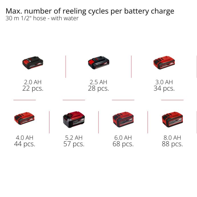 S Einhell akumulatorskim zidnim nosačem za vrtno crijevo GE-HR 18/30 WH Li-Solo vrt će biti zalijevan kao nikada prije. Ručno namatanje crijeva pripada prošlosti zahvaljujući snažnom 18 V Power X-Change bateriji. Akumulatorski zidni nosač za vrtno crijevo isporučuje se bez vrtnog crijeva i idealan je kada već imate vlastito vrtno crijevo. Pritisak na gumb omogućuje automatsko namatanje maksimalno 30 m dugog vrtnog crijeva maksimalnog promjera od 12,5 mm (1/2"). Slobodno pozicionirana kugla za zaustavljanje na vrtnom crijevu, prikladna za crijeva promjera 12,5 mm (1/2"), jamči automatsko zaustavljanje motora i sprječava oštećenja. Tijekom namatanja, vođenje crijeva i četke za čišćenje na uvlačenju osiguravaju čisto uvlačenje crijeva bez savijanja. Crijevo se može neprekidno izvlačiti. Zidni nosač za vrtno izrađen je od plastike otporne na UV zračenje i prskanje vode, osiguravajući tako optimalnu otpornost na vremenske uvjete. Pomoću odvoda za preostalu vodu u bubnju voda i vlaga se izvlače iz kućišta. Akumulatorski zidni nosač za vrtno može se koristiti i fiksno i mobilno. Zahvaljujući uključenom zidnom nosaču, nosač za vrtno crijevo se može optimalno pričvrstiti na zid kuće ili šupe. Tamo je pomičan za 90° ulijevo i udesno. S fiksnim, 1,5 m dugim priključnim crijevom promjera 12,5 mm (1/2") i odgovarajućim standardnim spojnicama za slavinu (1", 1/2", 3/4"), nosač se može priključiti na vodovodnu slavinu. Mobilno zalijevanje travnjaka s akumulatorskim zidnim nosačem za vrtno crijevo omogućuje i zasebno dostupna kolica za crijevo. Uključene su i dvije brze spojnice. Akumulatorski zidni nosač za vrtno crijevo isporučuje se bez baterije, punjača i vrtnog crijeva. Navedeni se artikli mogu kupiti zasebno. Solo model – isporučuje se bez akumulatora i punjača
