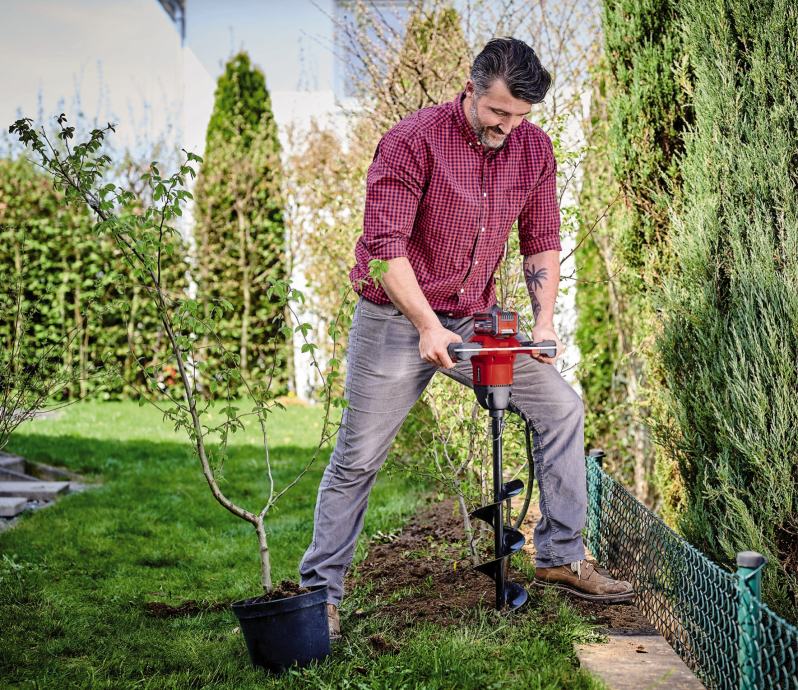 Za sve koji imaju vrt ili parcelu, akumulatorska bušilica za zemlju Einhell GP-EA 18/150 Li BL Solo moćan je pomoćnik ne samo kada je u pitanju sadnja već i za sve vrste drugih vrtnih poslova kao što su postavljanje stupova za ogradu, sidrenje ukrasa u tlu, ili čak iskopa kružnih temelja. Ovaj se akumulatorski alat isporučuje zajedno s nastavkom za puž (dužina 80 cm / promjer 15 cm). Akumulatorska bušilica za zemlju član je obitelji Power X-Change iz Einhella, u kojoj se punjive baterije s visokokvalitetnim litij-ionskim ćelijama mogu kombinirati sa svim sistemskim uređajima iz asortimana. Ovaj proizvod dolazi bez baterije i punjača; ove stavke su dostupne zasebno. Za rad bušilice za zemlju potrebna je jedna punjiva baterija PXC 18 V. Bušilica za zemlju buši tlo pomoću motora bez četkica koji svoju snagu prenosi na optimalan način i također traje dulje od konvencionalnih motora s grafitnim četkicama. Još jedna značajna značajka ovog akumulatorskog alata je njegova robusna aluminijska glava zupčanika. Bušilica za zemlju može se postaviti na tri različita načina rada: 1) U smjeru suprotnom od kazaljke na satu za pomicanje tla prema gore ili za popuštanje bušilice 2) rotaciju u smjeru kazaljke na satu u standardnom načinu rada. Redovita postavka sile za jednostavne zadatke bušenja na mekom tlu i 3) rotaciju u smjeru kazaljke na satu u načinu pojačanja. Postavka maksimalne sile za tvrde površine. Maksimalnu stabilnost i otpornost na torziju osigurava robusni metalni okvir, a za praktično rukovanje i ergonomski rad tu je dvostruka ručka s mekim rukohvatom.
