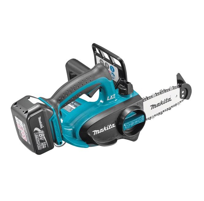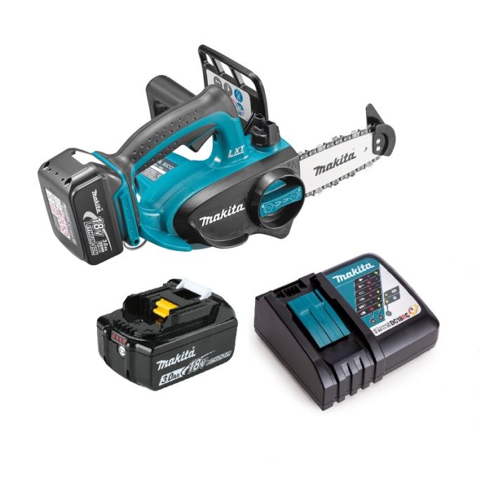 Makita DUC122 je odlična pila za radove orezivanja u vrtu, okučnici ili u voćnjaku. U ovom setu isporučuje se s dva akumulatora kapaciteta 3,0Ah i brzim punjačem. (akumulator 3,0Ah puni za cca 22min) Sve zajedno dolazi u transportnom koferu. Značajnije karakteristike i prednosti ove aku lančane pile su: Automatsko podmazivanje lanca Poluga za otključavanje za sprječavanje slučajnog uključivanja Štitnik vrha je prikladan za radove iznad glave i sprječavanje povratnog udarca Metalna kuka omogućuje korisniku penjanje na drva obim rukama, montirajte kuku na kraju konopa priključenog na remenje za penjanje Zamjena i zatezanje lanca pile bez uporabe alata Ergonomska meka ručka presvučena gumom Drastično povećana brzina rezanja sa snažnijim motorom Mogućnost korištenja teleskopskog produžetka (opcijski) https://www.youtube.com/watch?v=2weuIgj0nRA makita aku motorna pila Napon akumulatora 18 V - LXT Kapacitet akumulatora1,5 / 2,0 / 3,0 / 4,0 / 5,0 / 6,0 Ah Vrsta akumulatoraLi-ion Zapremnina ulja 0,08 l Korak lanca1/4 " Širina utora 1,3 mm Dužina vodilice 115 mm Brzina lanca5 m/s Buka: zvučni tlak 84,6 dB(A) Buka: zvučna snaga 92,7 dB(A) Buka: odstupanje (K)2 dB(A) Vibracije: piljenje4,3 m/s² Vibracije: odstupanje (K) 1,5 m/s² Dimenzije (D x Š x V) 422 x 195 x 215 mm Masa (prema EPTA) 2,6 kg Obujam isporuke: Aku lančana pila DUC122 Punjač DC18RC Akumulator 2 x BL1830B Plastični kofer