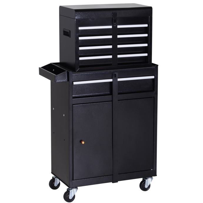 Ovdje ima puno mjesta: Prostrani ormar za alat marke [BRAND NAME] ima prostrani donji ormar s jednom velikom i četiri manje ladice, kao i uklonjivu kutiju za alat. Unutar vrata ormara naći ćete praktičnu ploču s perforacijama za alate koje najčešće koristite i želite da vam budu lako dostupni. Ovaj ormar za alat savršen je za garažu, radionicu ili vrtnu šupu. Opis: ✔ S 4 gumena kotačića, jedan s kočnicom ✔ Bočna košara za pohranu malog alata poput odvijača, kliješta itd. ✔ Uklonjiva kutija za alat s ručkama za nošenje ✔ Protuklizna podloga ispod kutije za alat ✔ Svaka ladica obložena podstavljenom podlogom ✔ Ploča s rupama za alat s unutarnje strane vrata ormarića ✔ S šipkama za zaključavanje za sigurnost i organizaciju, čak i prilikom pomicanja ormarića za alat (zaključava se, brava i ključ nisu uključeni) ✔ Jednostavna montaža Tehničke specifikacije: ✔ Materijal: Metal ✔ Boja: Crna ✔ Ukupne dimenzije: D60 x Š28 x V104,5 cm✔ Gornji pretinac: D45 x Š24 x V32,5 cm✔ Osnovne dimenzije: D52,5 x Š28 x V71 cm✔ Dimenzije gornje ladice: D38,5 x Š20,5 x V4,5 cm✔ Dimenzije donje ladice: D46 x Š25,5 x V7,5 cm✔ Unutarnje dimenzije ormarića: Š48 x Š26 x V40,5 cm✔ Dimenzije protuklizne podloge: D52 x Š27,5 cm✔ Težina: 19 kg✔ Maksimalna nosivost: 35 kg (ukupno), 5 kg (gornja ladica), 12 kg (donja ladica)Opseg isporuke:✔ 1 x ormarić za alat✔ 1 x upute za sastavljanje