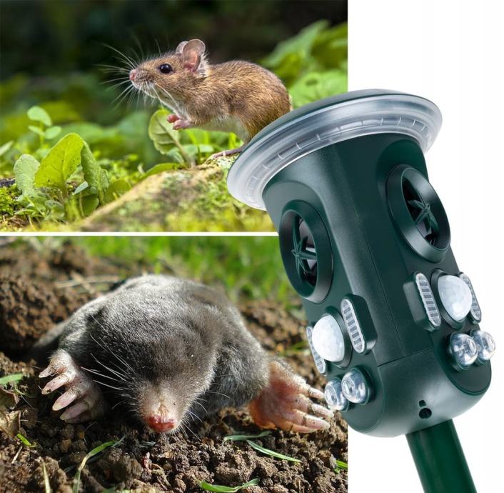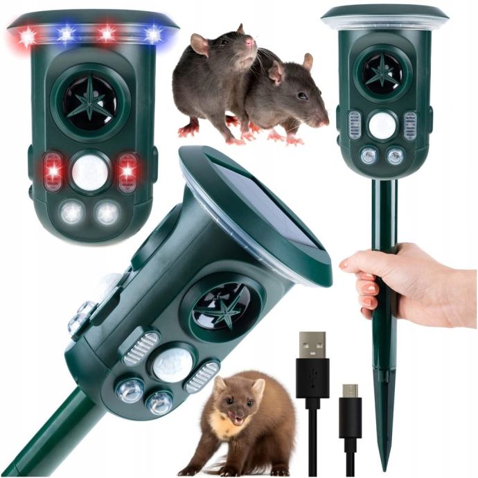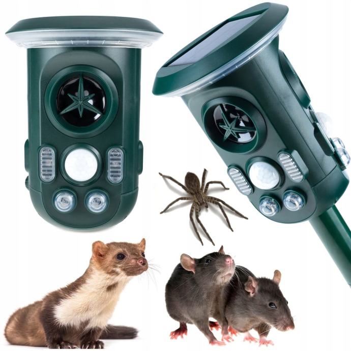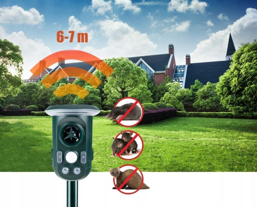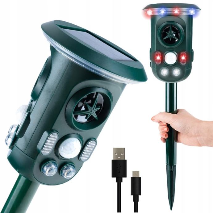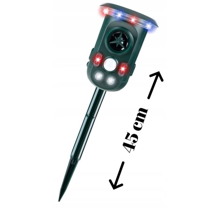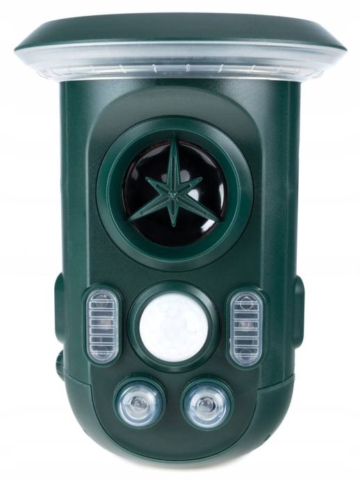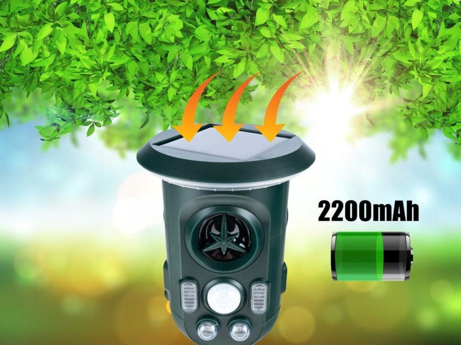 Učinkovit repeler na životinjama koji radi na principu emitiranja različitih ultrazvučnih frekvencija i jake LED svjetlosti.