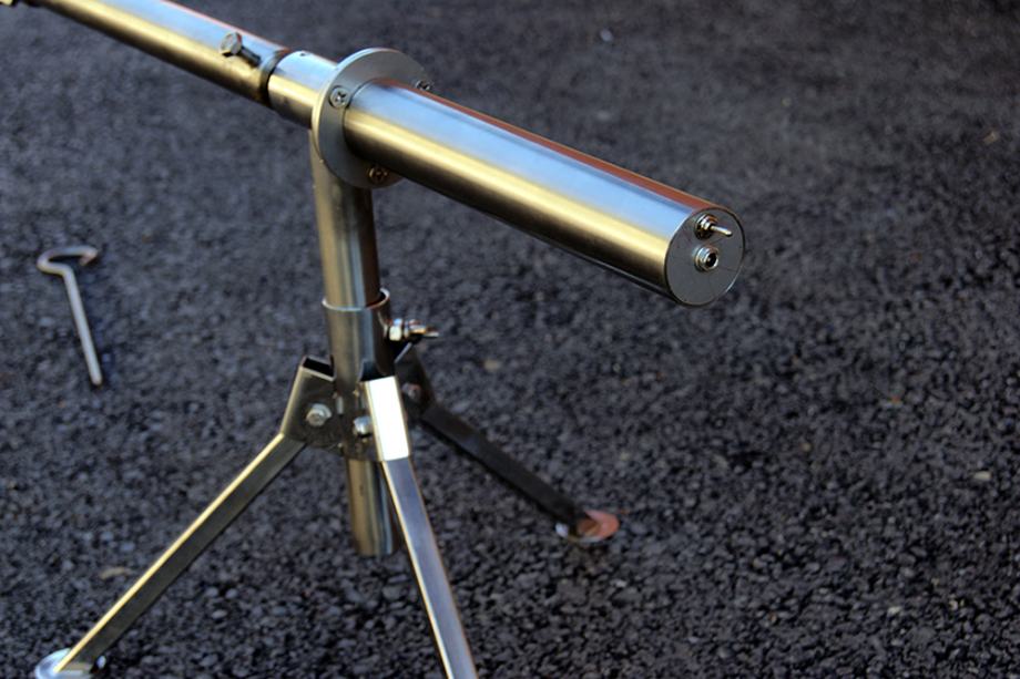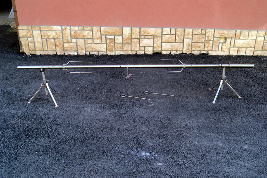 Komplet za ražanj na otvorenom. Kompletno od inox-a. Duljina cijevi ražnja 200 cm. Rasklopivi INOX stalci sa opcijom podešavanja visine pečenja i kardanom odličan su izbor za pečenje na otvorenom posebice na neravnim površinama, zbog kardana koji pruža izuzetan rad bez ikakvog gubitka snage i pod kosinom od 30 stupnjeva.