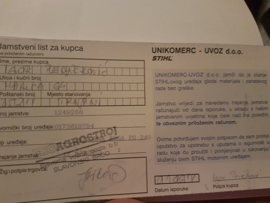 Ja sam prvi vlasnik trimera (čistača), što je vidljivo i na jamstvenom listu.