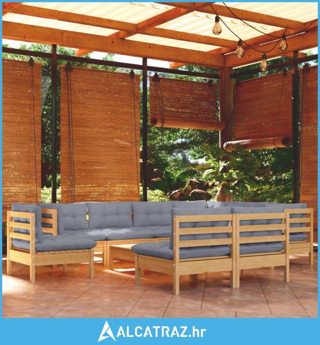 10-dijelna vrtna garnitura sa sivim jastucima masivna borovina - NOVO