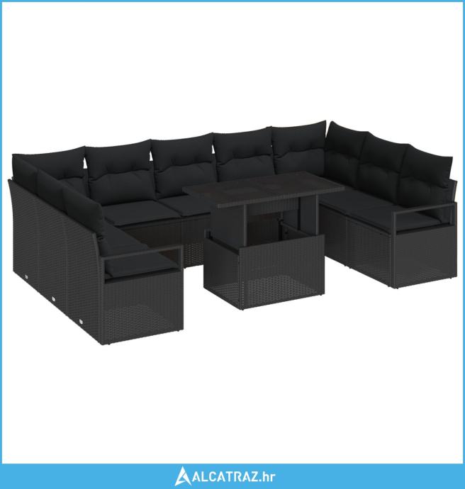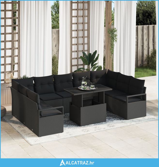 10-dijelni vrtni kauč set s jastučićima crni poli ratan, 2-sjedni vrtn