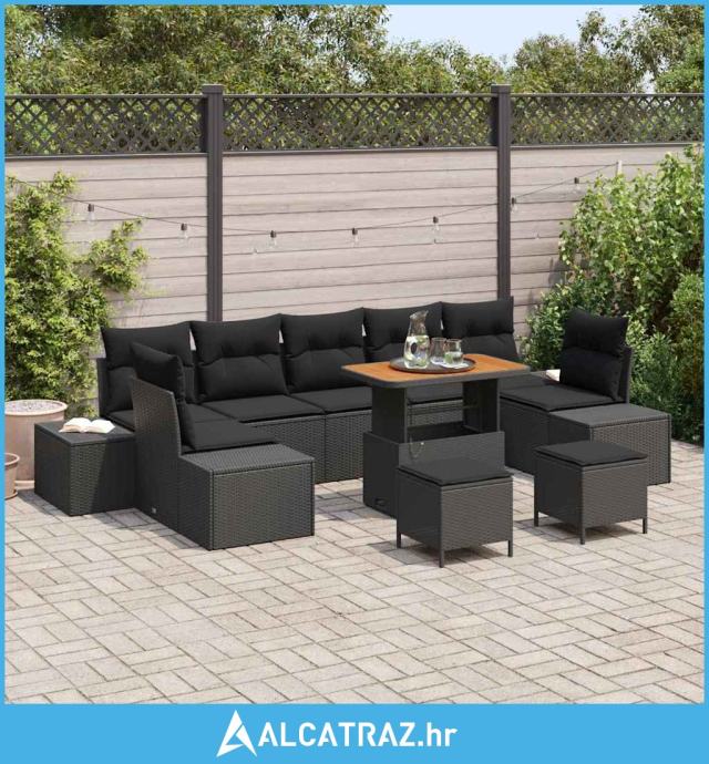 10 dijelni vrtni set sofe s jastučićima crni poliratan akacija, 2-sjed