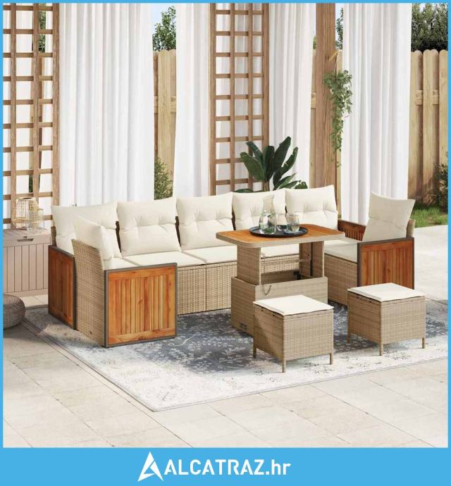 10-dijelni Vrtni Sofa Set s Jastucima Bež Poli Ratan Akacija - NOVO