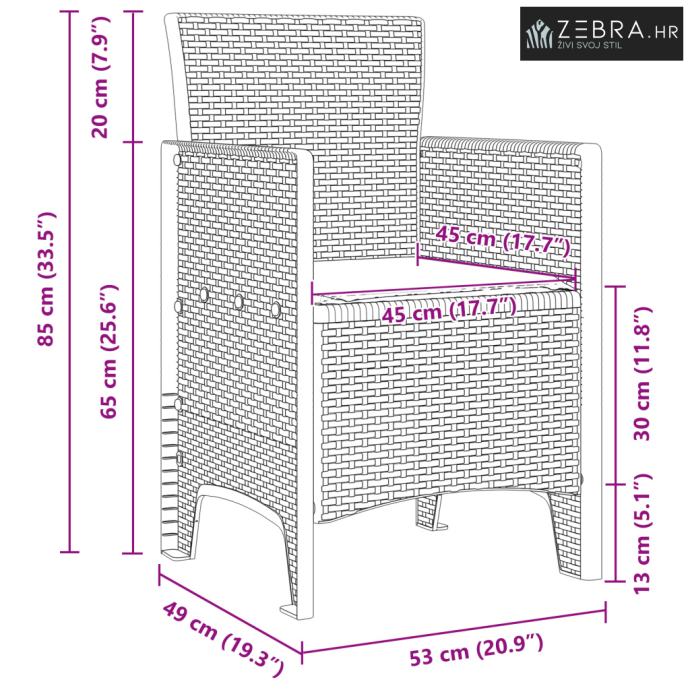 Poliratan izrada Cijeli set je izrađen od visokokvalitetnog poliratana, poznatog po svojoj izdržljivosti i sposobnosti da izdrži različite vremenske uvjete. Njegova moderna tekstura dodaje estetski dojam dok osigurava trajnost tijekom vanjskih sezona. Uključujući mat završne obrade, materijali nude sofisticirani neodsjaj koji besprijekorno nadopunjuje prirodno okruženje.
