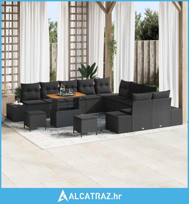 13-dijelni vrtni kauč set s jastučićima Crni poli ratan akacija - NOVO