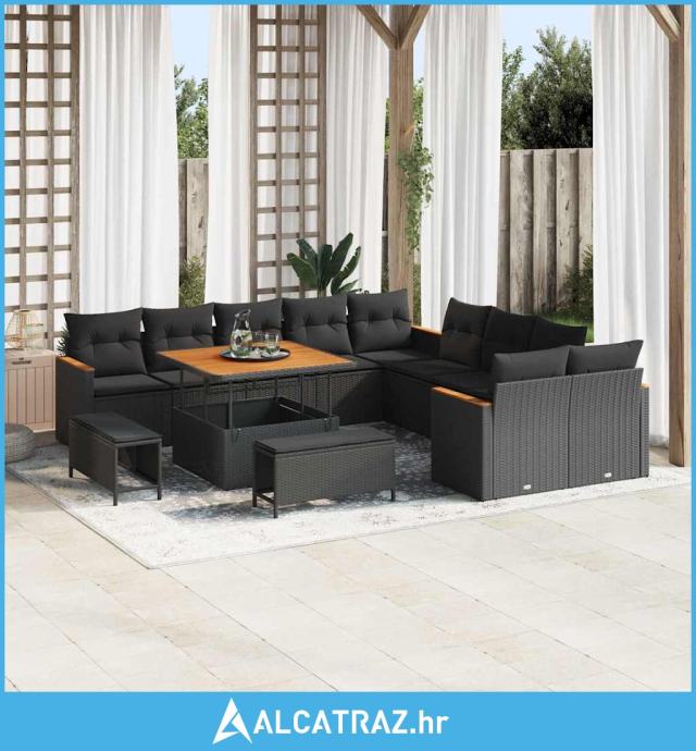 13 Dijelni Vrtni Sofa Set s Jastučićima Crni Poli Ratan Akacija - NOVO