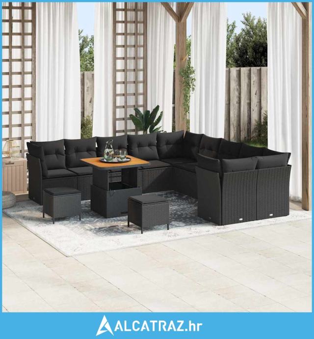13-dijelni Vrtni Sofas Set s Jastučićima Crni Poli Ratan Akacija - NOV