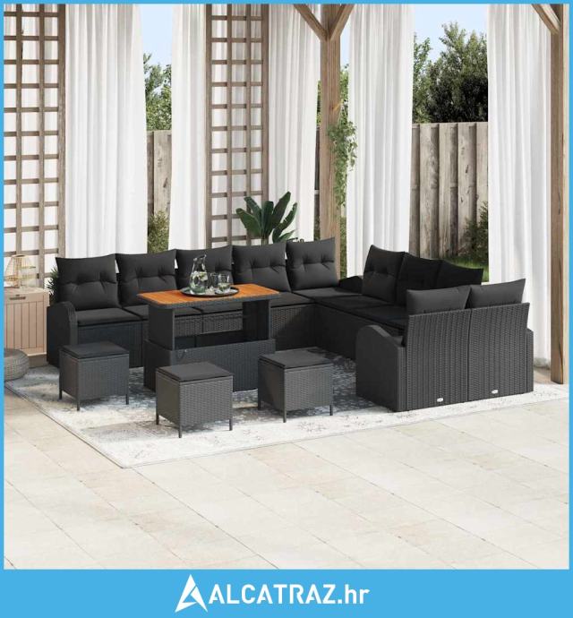 14-dijelni vrtni kauč set s jastučićima crni poli ratan akacija - NOVO