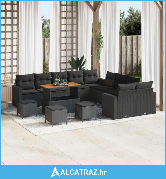 14 Komadna Vrtna Sofa s Jastucima Crni Poli Rattan Akacija, 4 Komadni
