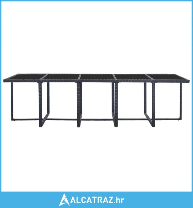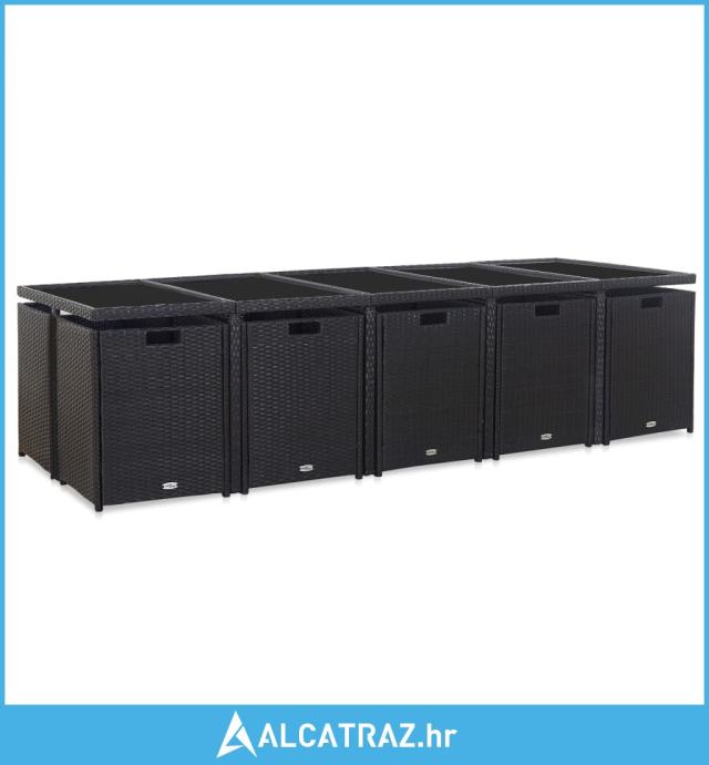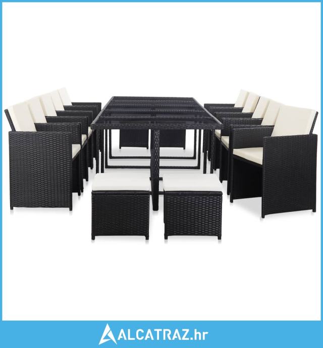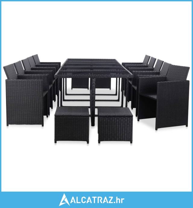 Isporuka uključuje 1 stol sa staklenom površinom, 10 stolica od ratana, 4 taburea i 24 odvojiva jastuka.