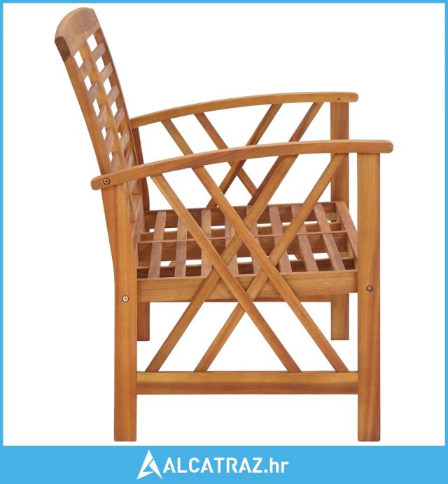 Ovaj set vanjskog namještaja izrađen je s konstrukcijom od masivnog bagremovog drva s uljnim premazom, zbog čega je stabilan i izdržljiv. Zahvaljujući stolnoj ploči od masivnog drva s rešetkastim dizajnom, stolić za kavu nudi vam prostor za stavljanje grickalica, košara s voćem, ukrasnih predmeta, kao i ostalih potrepština. Lagano zaobljen naslon za leđa i oslonci za ruke pridonose udobnosti sjedenja na klupi.