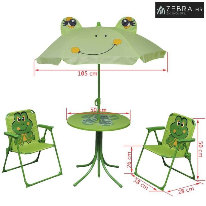 Uz čvrsti čelični okvir, ova vrtna garnitura je izdržljiva i čvrsta ,pružit te će siguran smještaj za vašu djecu. Uključeni suncobran će zaštiti vaše mališane od sunca. Stolice se mogu preklopiti radi uštede prostora za pohranu,kada nije u upotrebi.