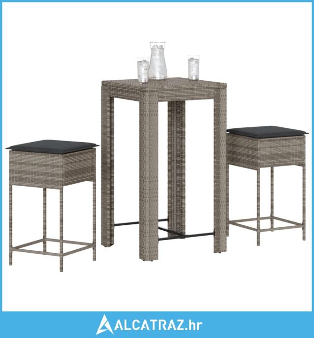 3-dijelni vrtni barski set od poliratana s jastucima sivi - NOVO