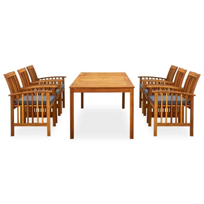 The dining table is made of solid acacia wood, a hardwood with dense grains, which makes it sturdy, durable and easy to maintain. The wooden tabletop can be used to place foods, drinks and other items. Featuring a wooden frame with an oil finish, these dinner chairs bring a classic look to your patio or backyard while giving your outdoor space a natural feel. The thickly padded cushions also add extra seating comfort in your lounging time. Additionally, this set is easy to clean with a damp cloth.