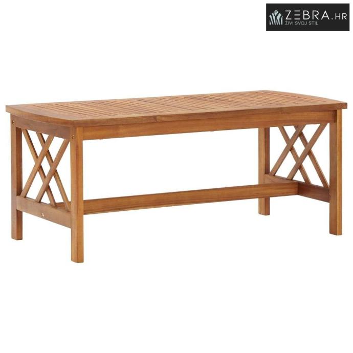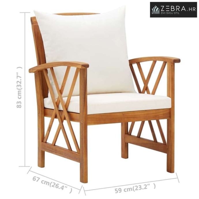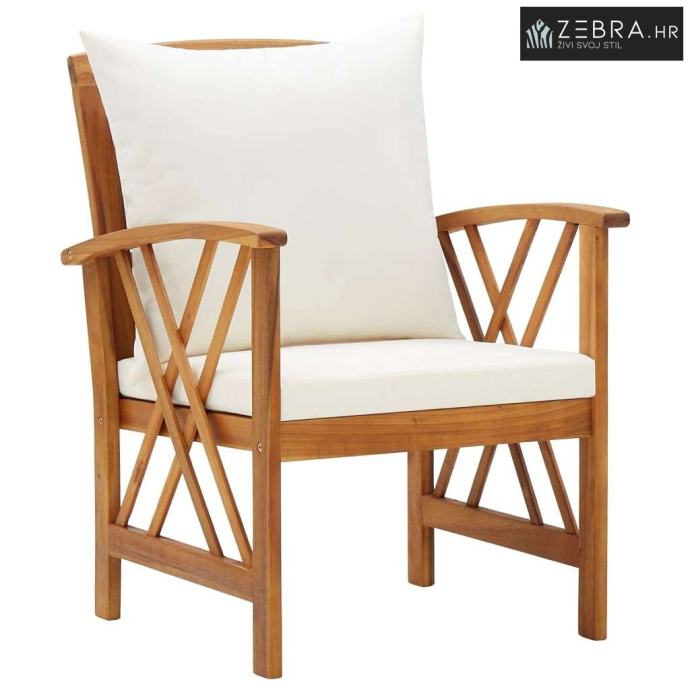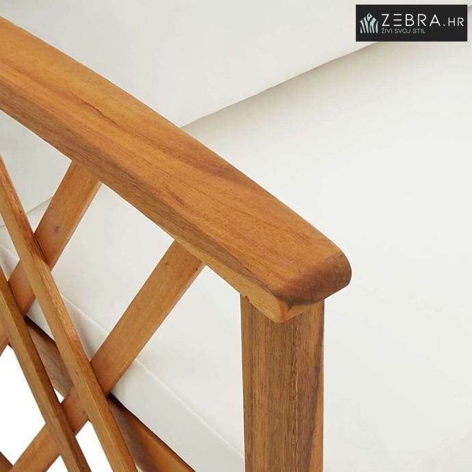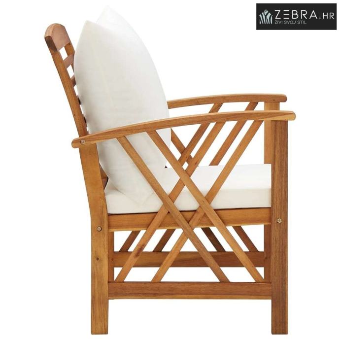 Ovaj set vanjskog namještaja izrađen je s konstrukcijom od masivnog bagremovog drva s uljnim premazom, zbog čega je stabilan i izdržljiv. Zbog debelih jastuka za sjedalo i naslon, set je mekan za sjedenje. Zahvaljujući stolnoj ploči od masivnog drva s rešetkastim dizajnom, stolić za kavu nudi vam prostor za stavljanje grickalica, košara s voćem, ukrasnih predmeta, kao i ostalih potrepština. Lagano zaobljen naslon za leđa i oslonci za ruke pridonose udobnosti sjedenja na klupi i stolicama.