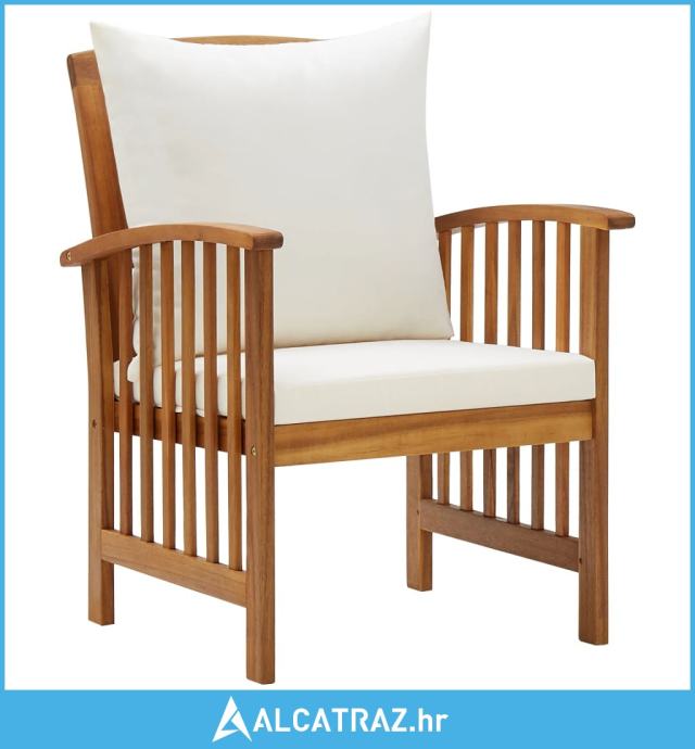 Ova drvena vrtna garnitura dodaje starinski izgled i posebno je dizajnirana za vaš vrt, terasu ili drugi otvoreni prostor za boravak! Ovaj set vanjskog namještaja izrađen je s konstrukcijom od masivnog bagremovog drva s uljnim premazom, zbog čega je stabilan i izdržljiv. Zbog debelih jastuka za sjedalo i naslon, set je mekan za sjedenje. Zahvaljujući stolnoj ploči od masivnog drva s rešetkastim dizajnom, stolić za kavu nudi vam prostor za stavljanje grickalica, košara s voćem, ukrasnih predmeta, kao i ostalih potrepština. Lagano zaobljen naslon za leđa i oslonci za ruke pridonose udobnosti sjedenja na stolicama. Važna napomena: Boje i godovi variraju od primjerka do primjerka, što čini svaki komad jedinstvenim; primjerci se dostavljaju slučajnim odabirom.