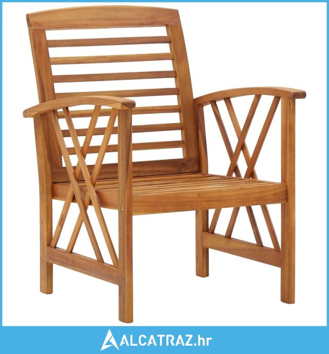 Ovaj set vanjskog namještaja izrađen je s konstrukcijom od masivnog bagremovog drva s uljnim premazom, zbog čega je stabilan i izdržljiv. Zahvaljujući stolnoj ploči od masivnog drva s rešetkastim dizajnom, stolić za kavu nudi vam prostor za stavljanje grickalica, košara s voćem, ukrasnih predmeta, kao i ostalih potrepština. Lagano zaobljen naslon za leđa i oslonci za ruke pridonose udobnosti sjedenja na stolicama.