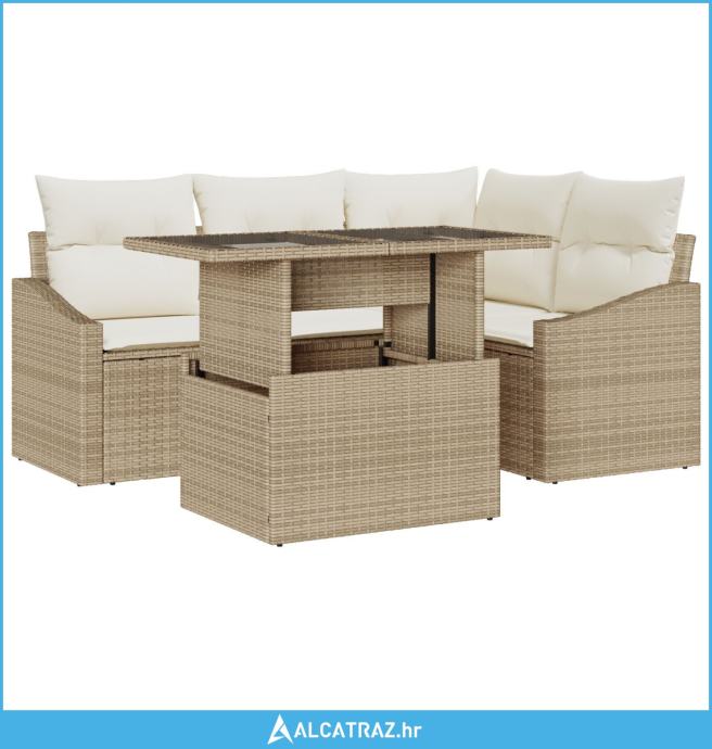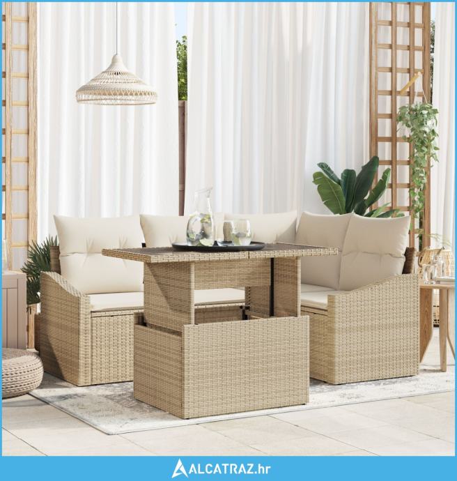 - Stil: Kombinacija bež poli ratana i krem jastučića stvara toplu vibru koja dodaje eleganciju tvom vanjskom prostoru.