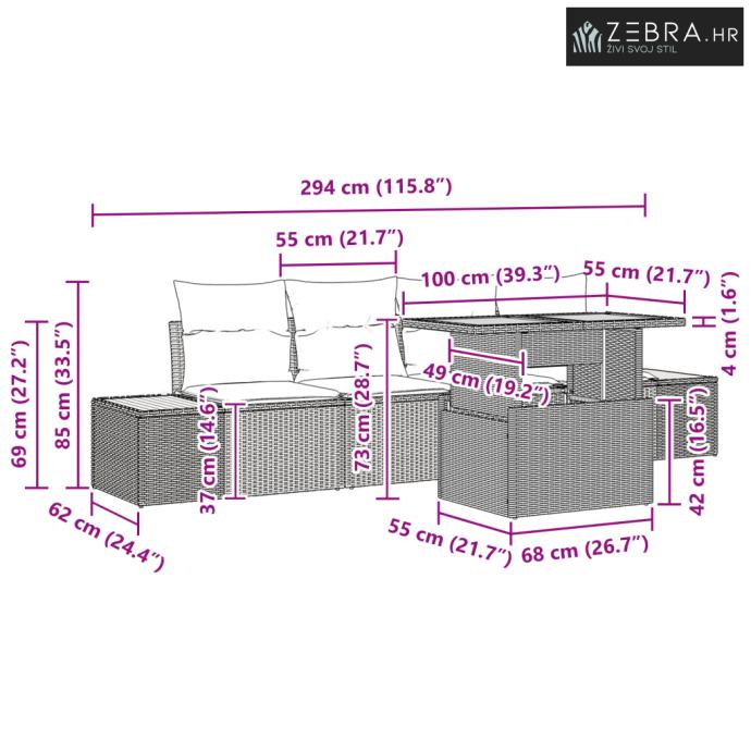 Fleksibilnost Ovaj set ima modularne dijelove koje možeš rasporediti na razne načine, prilagođavajući ih svom prostoru. Bilo da želiš udoban kutak ili veći raspored za zabavu, lako možeš prilagoditi postavku svojim potrebama.