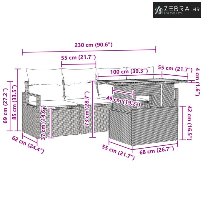 Funkcionalne Komponente: Set dolazi s dva naslonjena sofa i dva srednja sjedala, svako s ugrađenim prostorima za pohranu, kako bi ti olakšao organizaciju vanjskih stvari. Tu je i čvrsti vrtni stol od drva akacije, idealan za obroke i opuštanje. Sve je dizajnirano da ti olakša život i zadrži stvari urednima.