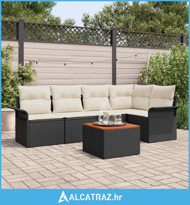 6-Comadni vrtni kauč set s jastučićima crni poli ratan akacija - NOVO