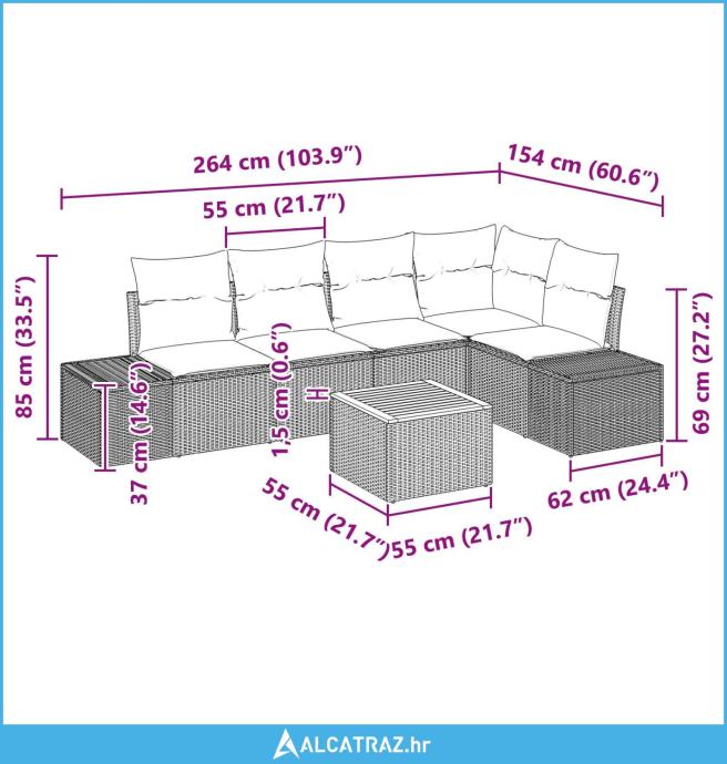 - Delivery Contains: 2 x središnja sjedišta s prostorom za pohranu, 1 x kutno sjedište s prostorom za pohranu, 2 x sofa s prostorom za pohranu, 1 x vrtni stol