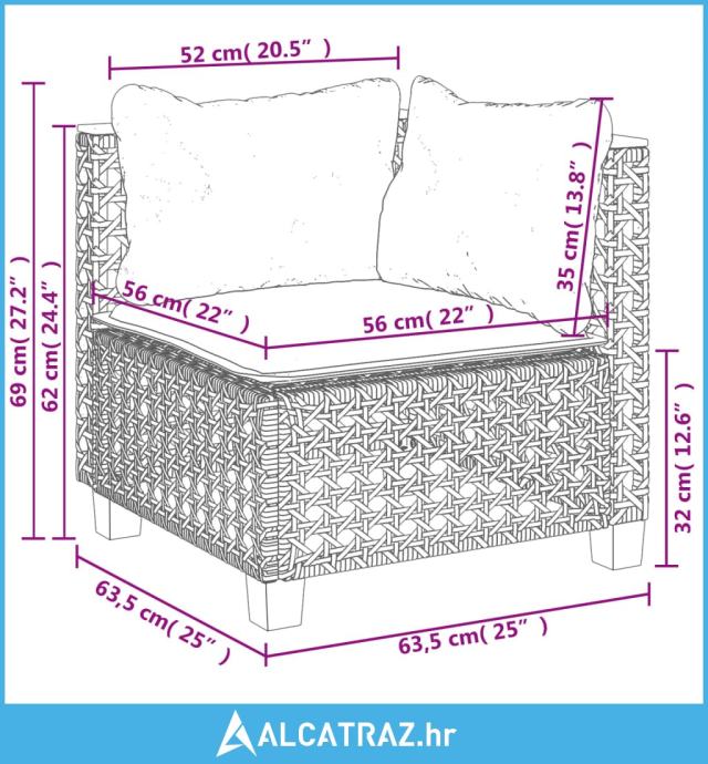 - Dimenzije jastuka za sjedenje (kutna): 56,5 x 56,5 x 3 cm (Š x D x T)