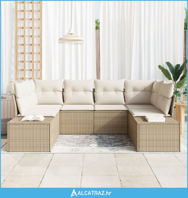 Ova vrtna sofa s šest modularnih komada je savršena za opuštanje na otvorenom u sunčanim danima. Chic bež i krem boje dodaju moderni izgled terasama, balkonima ili vrtovima, stvarajući odlično mjesto za druženje ili opuštanje u stilu.