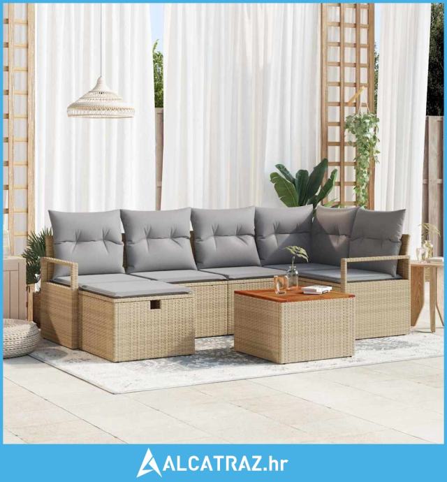 Ova sedmodijelna garnitura za vrt podiže opuštanje na otvorenom. Moderna je i čvrsta, napravljena od kvalitetnog bež poli ratana i svijetlosivih jastučića. Ovaj set se savršeno uklapa u balkone, patije ili bilo koje vanjske prostore. Elegantna bež boja se izvrsno slaže sa svijetlosivim jastučićima, stvarajući ugodnu atmosferu koja poziva tebe i tvoje prijatelje na opuštanje.