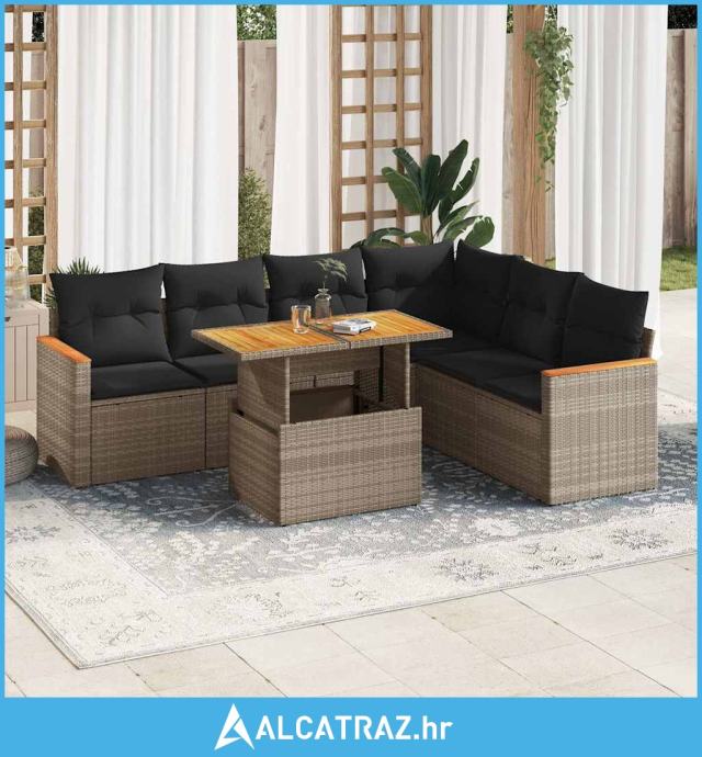 7-dijelni set vrtnih sofa poliratan i bagrem s jastucima sivi - NOVO