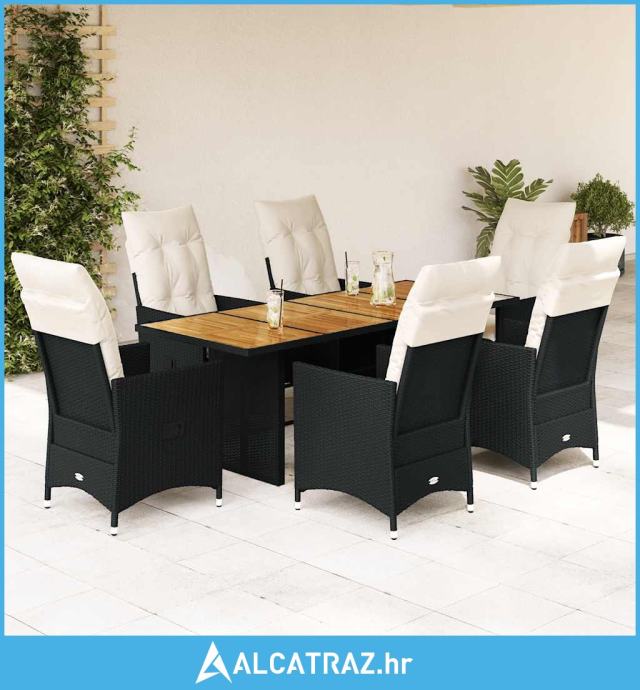 7-dijelni vrtni blagovaonski set s jastucima crni od poliratana - NOVO