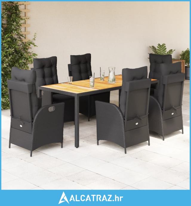7-dijelni vrtni blagovaonski set s jastucima crni od poliratana - NOVO
