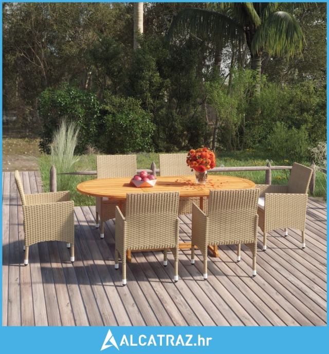 Blagovaonski stol napravljen je od masivnog bagremovog drva, zbog čega je čvrst i stabilan. Površina premazana uljem čini ga prikladnim i za vanjsku upotrebu. S čeličnim okvirom prekrivenim PE ratanom otpornim na vremenske utjecaje, stolice su čvrste i jednostavne za čišćenje. Debelo podstavljeni jastuci također daju dodatnu udobnost sjedenju dok se odmarate.