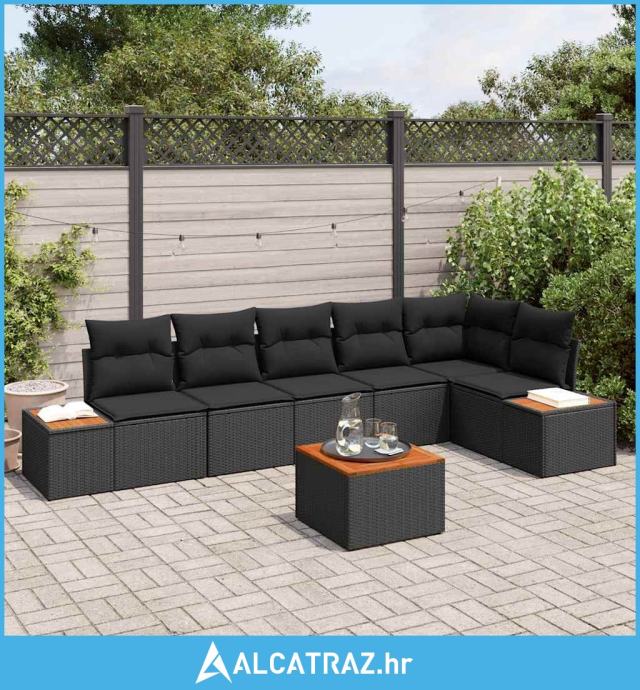 7-dijelni vrtni kauč set s jastučićima crni poli ratan akacija - NOVO