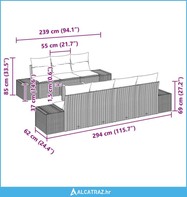 - Pakiranje sadrži: 3 x središnje sjedalo s pohranom, 4 x sofa s pohranom, 1 x vrtni stol