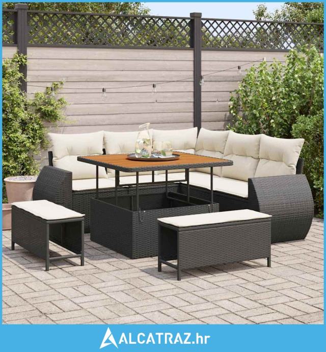 8 Kom Vrtni Sofa Set s Jastučićima Crni Poli Ratan Akacija - NOVO