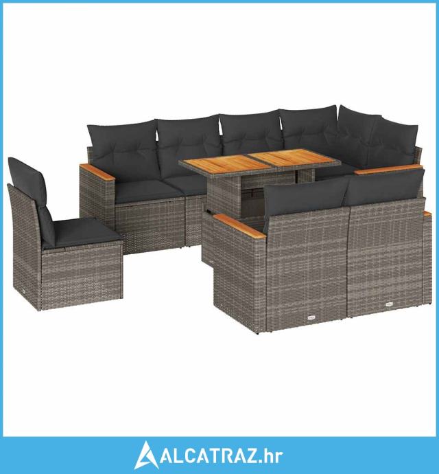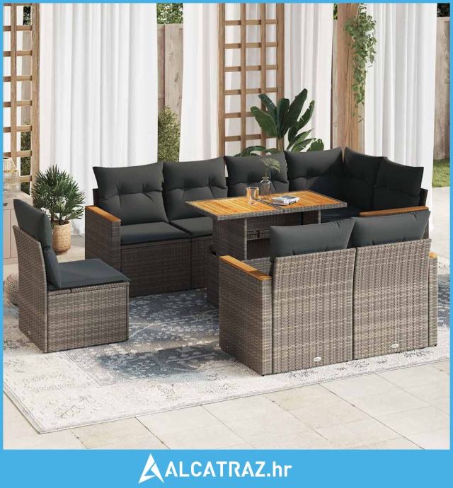 9-dijelni set vrtnih sofa poliratan i bagrem s jastucima sivi - NOVO