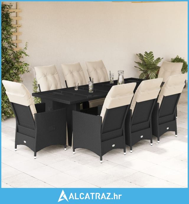 9-dijelni vrtni bistro set od poliratana s jastucima crni - NOVO