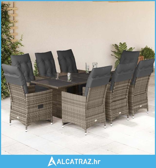 9-dijelni vrtni bistro set od poliratana s jastucima sivi - NOVO
