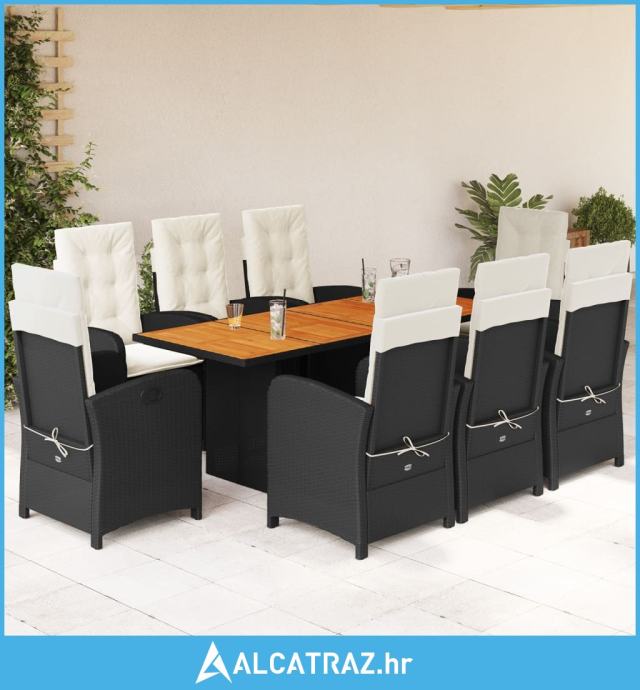 9-dijelni vrtni blagovaonski set s jastucima crni od poliratana - NOVO