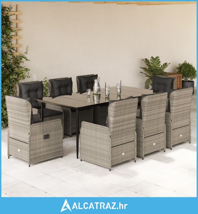 9-dijelni vrtni blagovaonski set od poliratana s jastucima sivi - NOVO