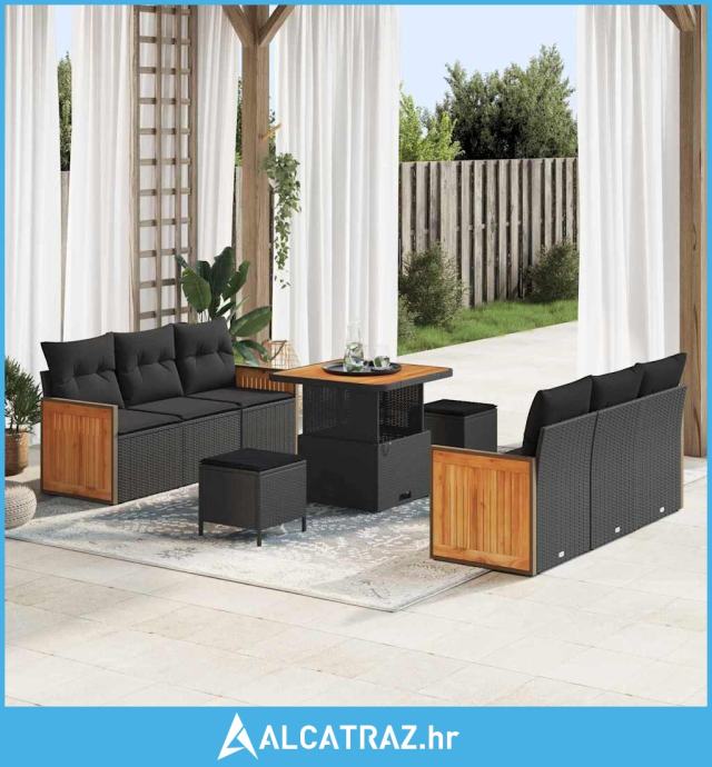 9-dijelni vrtni kauč set s jastucima crni poli ratan akacija, 3-dijeln