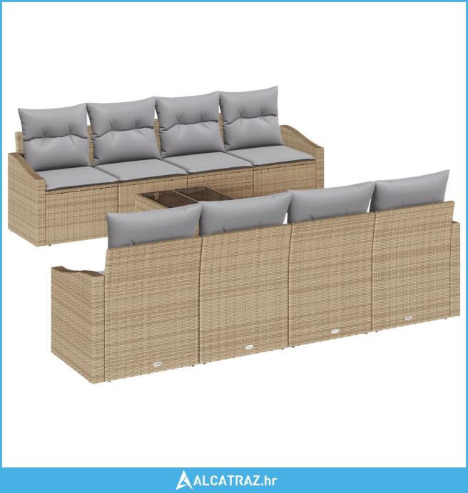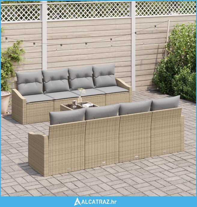 Ovaj vrtni set sofe daje ti udoban kutak za opuštanje i druženje, savršen za terase, balkone ili vrtove. S modernim bež poli ratanom i sivim jastučićima, kombinira stil i udobnost, idealan za obiteljska okupljanja.